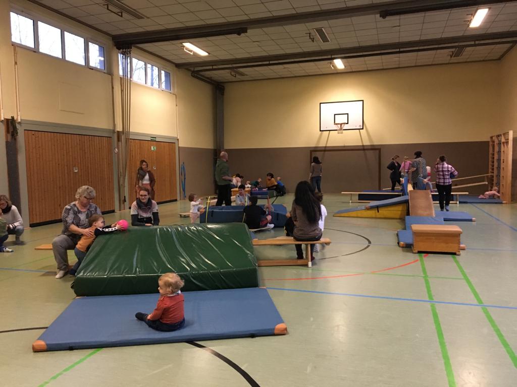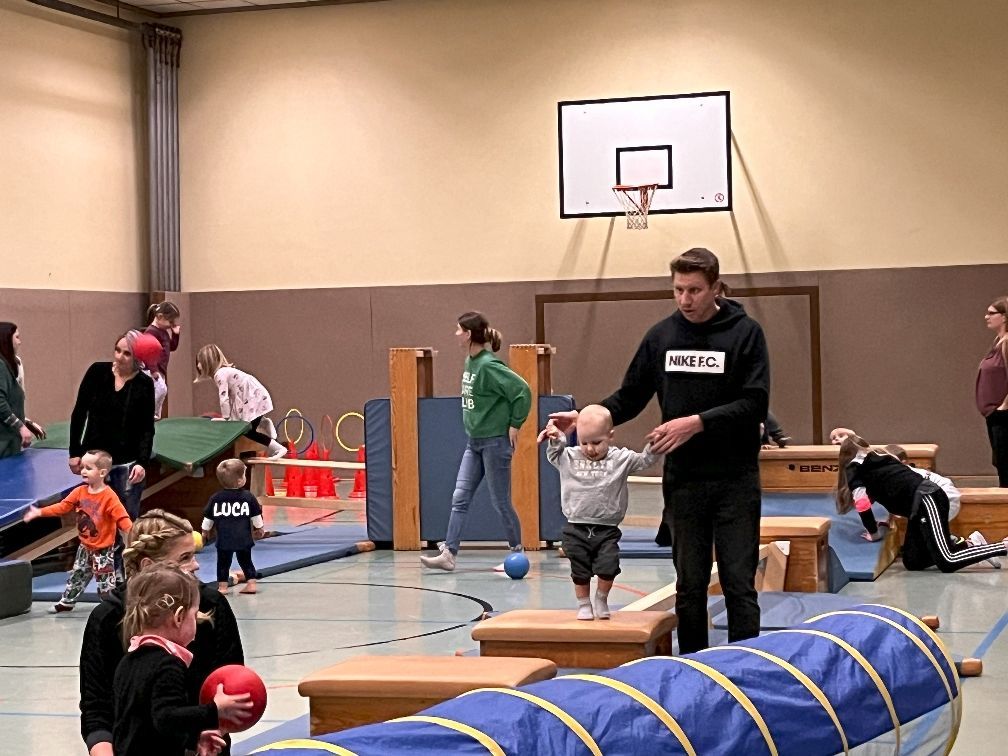 Dort nehmen die Kleinen /1-4 Jahre) erste Kontakte mit Sportgeräten auf. Hier können sie an verschiedenen Aufbauten krabbeln, rutschen, klettern, rollen oder hüpfen, sich verstecken und ausprobieren. Neben Kleingeräten wie Bälle, Springseile oder Gymnastikreifen, die zum Bewegen einladen, läuft auch immer Kindermusik im Hintergrund, so dass sogar getanzt werden kann. Ein festes Abschlussritual, welches die Übungsleiterin mit den Kindern und Eltern durchführt, läutet dann nach dem gemeinsamen Abbau das Ende ein der Stunde ein.